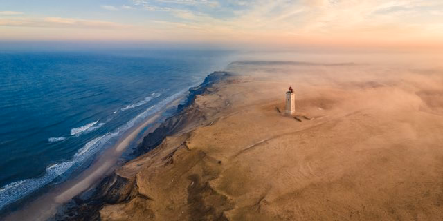 Oplev det ikoniske fyrtårn i det rå landskab ved Rubjerg Knude med udsigt over hav og klitter.